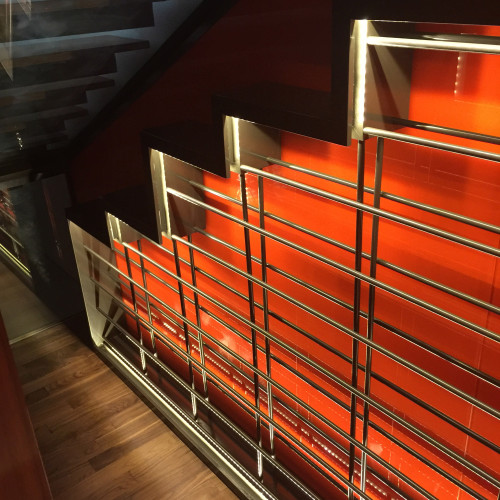 Bespoke Wine Cellar Dimensions 350cm x 100cm Finish: Rear coloured crystal glass, powder coated steel frame, Walnut veneer Other: With external cooling system, temperature controlled Designer: Elliot Barratt Concept: Required to blend...
