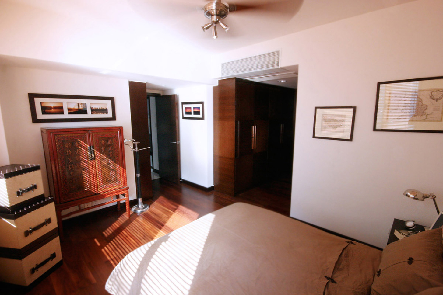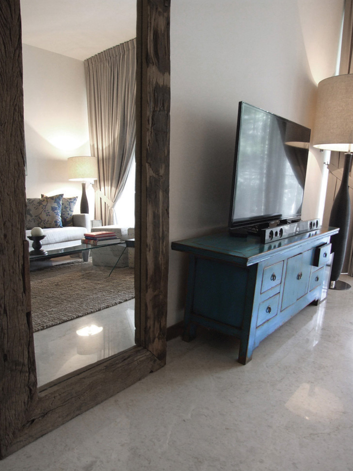 Using black woods, metallic furniture and accessories with natural linens Elliot James created a contrasting design with white walls and black framed photography, black framed furniture with light linen upholstery. Incorporating metallic items including Chinese drum stools and chrome finished trunks and TV console injected pops of light throughout.